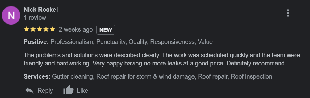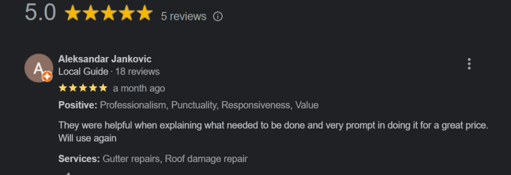 Services: Roof repair, Roof inspection, Gutter repairs, Roof damage repair